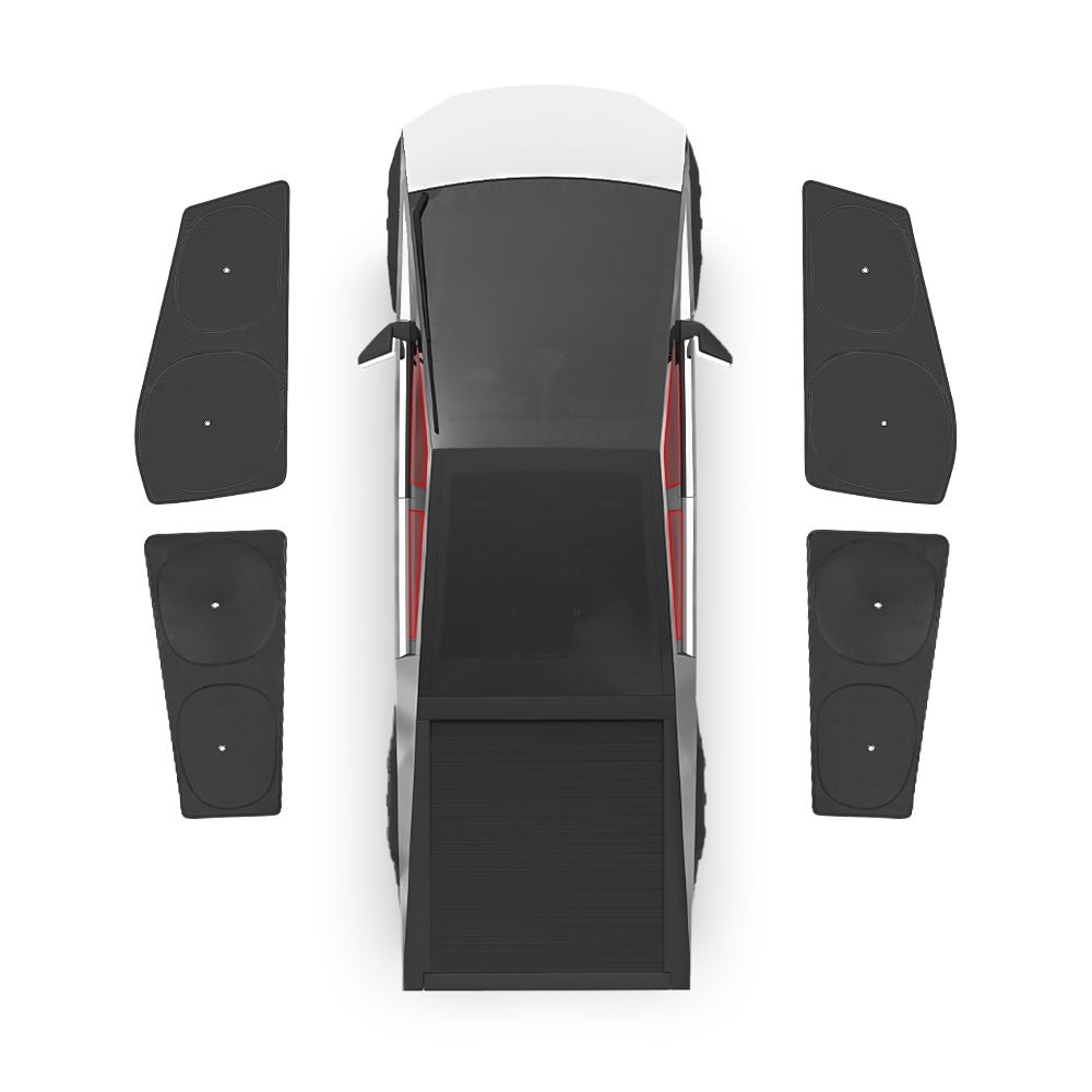 Our Privacy & Thermal Insulation Window Camping Sunshade Curtains are designed specifically for the Tesla Cybertruck. Engineered to block out two-thirds of solar heat, these sunshades significantly reduce the interior temperature, ensuring a comfortable environment while camping or parking. Made from reflective silver-coated high-density black fabric, they effectively shield against harmful UV rays while providing an ideal darkening effect for privacy during your outdoor adventures.