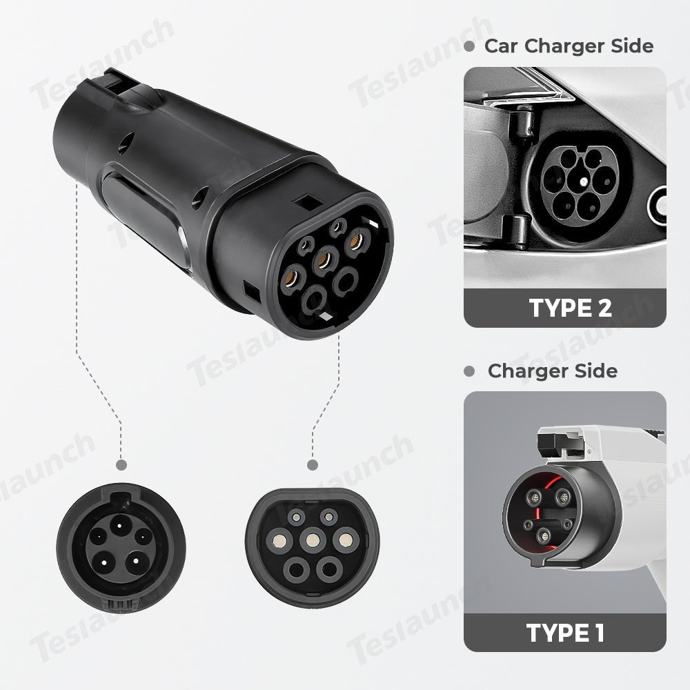 Maximize your electric vehicle charging capabilities with our complementary accessories: get the reverse configuration with our Type 2 to Type 1 EV charging adapter, add our Type 2 to Tesla/NACS EV charge adapter for Tesla compatibility, upgrade with our Tesla portable EV charger (16A/32A adjustable) for home charging, check out our CCS2 to Tesla AC+DC adapter, or get our Tesla to J1772 charging adapter (80A).