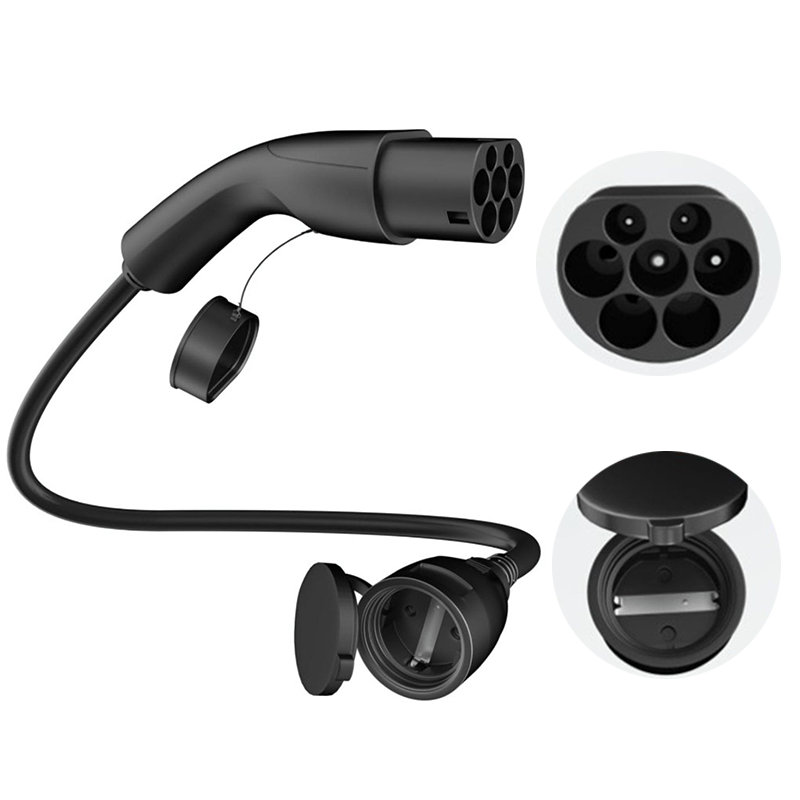The Type 2 Plug to Schuko Plug adapter is designed for powering public charging stations or wall-mounted charging boxes. It features a standard Schuko plug at one end, compatible with typical household sockets. This adapter facilitates charging for electric scooters, e-bikes, electric motorcycles, or electric wheelchairs.