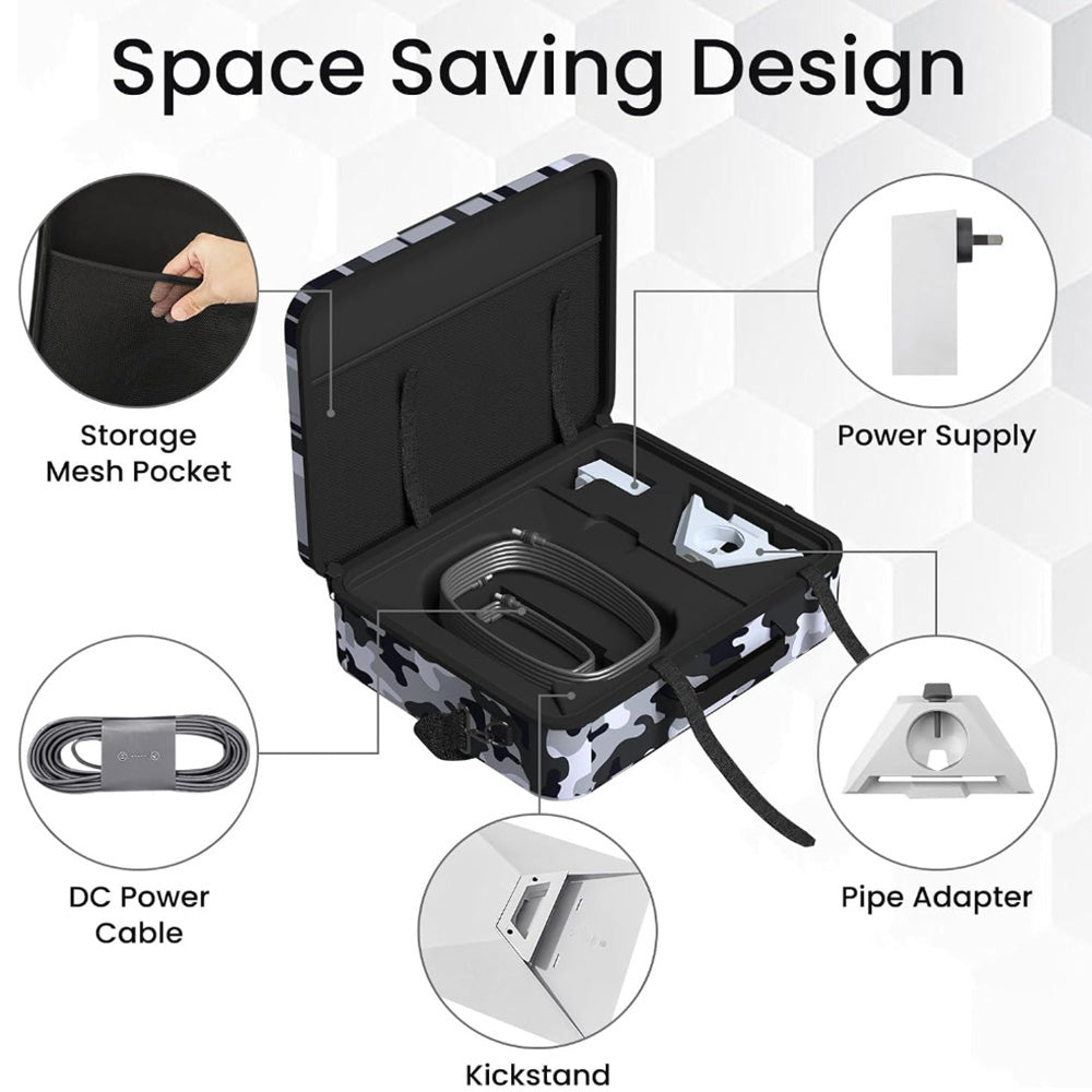 The Waterproof Travel Storage Case for Starlink Mini is designed to protect your Starlink Mini devices during travel and outdoor activities. Made from durable EVA material, it offers waterproof protection and shields your equipment from water, dust, and impact. This case features custom storage for your Starlink Mini dish, power cable, power supply, kickstand, and extra space for accessories. With a waterproof zipper, drop resistance, and a stylish camouflage exterior, this case is perfect for RV trips, camping, hiking, and more. It also includes a shoulder strap and handles for easy carrying.